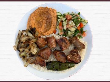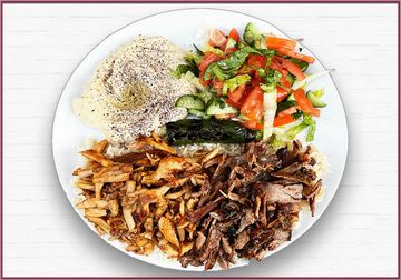 Turkish Style Beef Gyro served on the rice with Mediterranean Salad