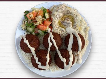 5 Pieces Falafel served on the rice with Mediterranean Salad