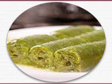 Rice, nuts, and spices, wrapped in grape leaves and cooked in olive oil and lemon juice
